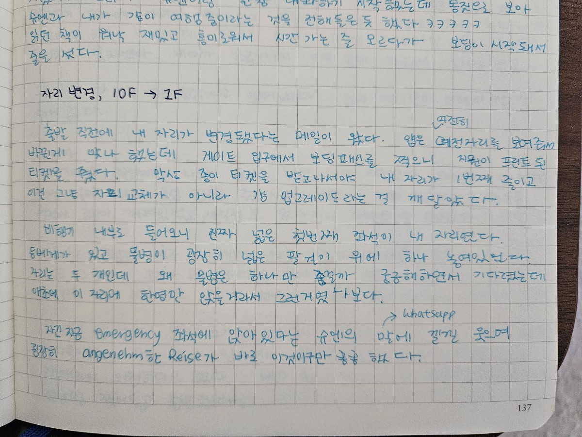 2024년 4월 24일 비행기 탄 날, 비행기 좌석 업그레이드 돼서 감동받음