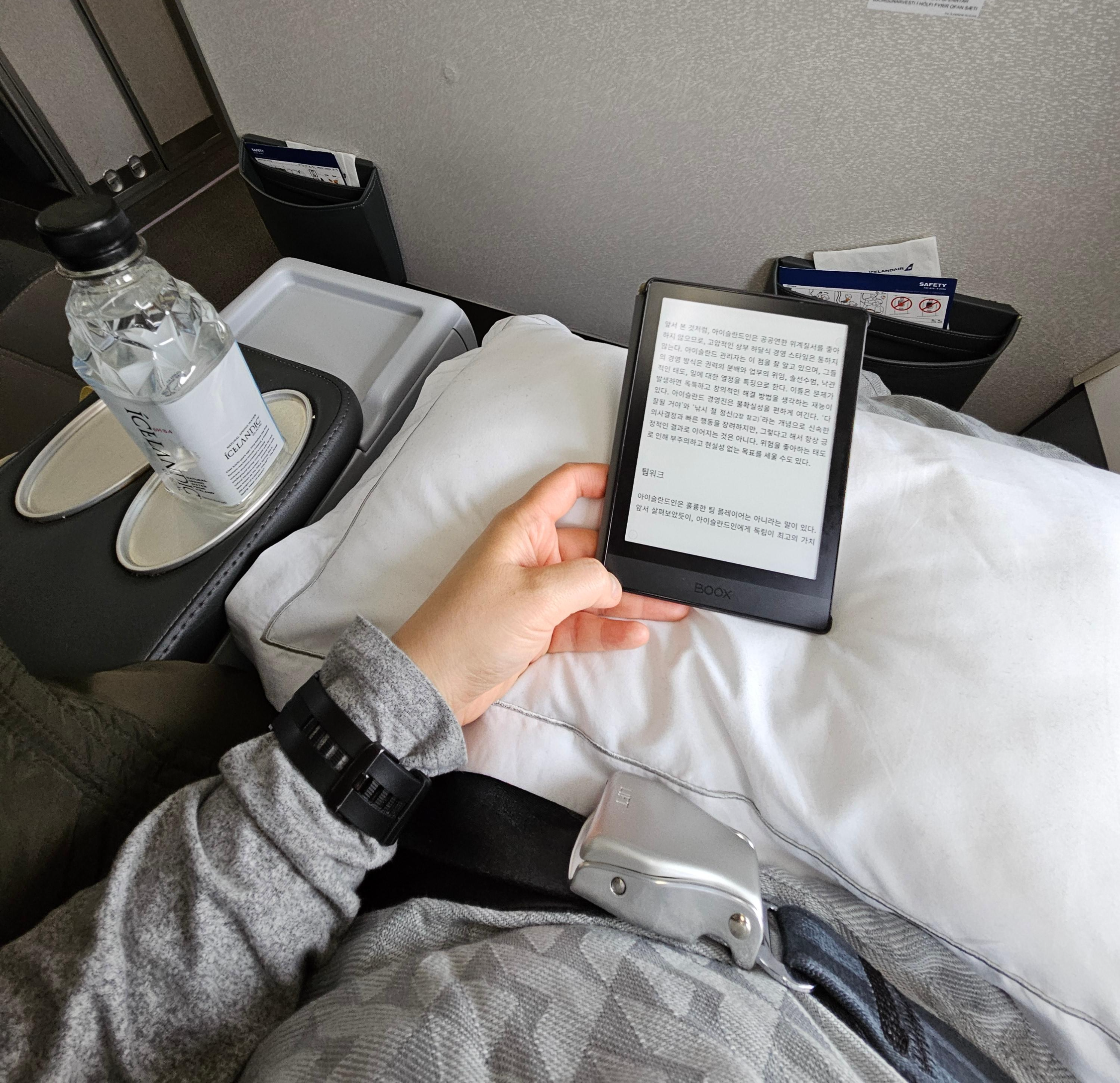 심지어 내 옆좌석과 뒷자석은 아무도 안 앉아서 정말 너무 편안했다. 세시간 반 비행동안 정말 이렇게 편할 수가 없었다. 전날 잠을 설쳐서 자리 앉자마자 바로 자야겠다고 생각하고 있었는데, 자리가 너무 아늑하고 편안해서 벌써 피로가 해소되는 기분! 부대끼지 않고 가도 된다니! 그래서 아이슬란드 문화에 관한 책을 한시간 넘게 읽고, 과자에 차에 밥에 이것저것 계속 주길래 신기했다.