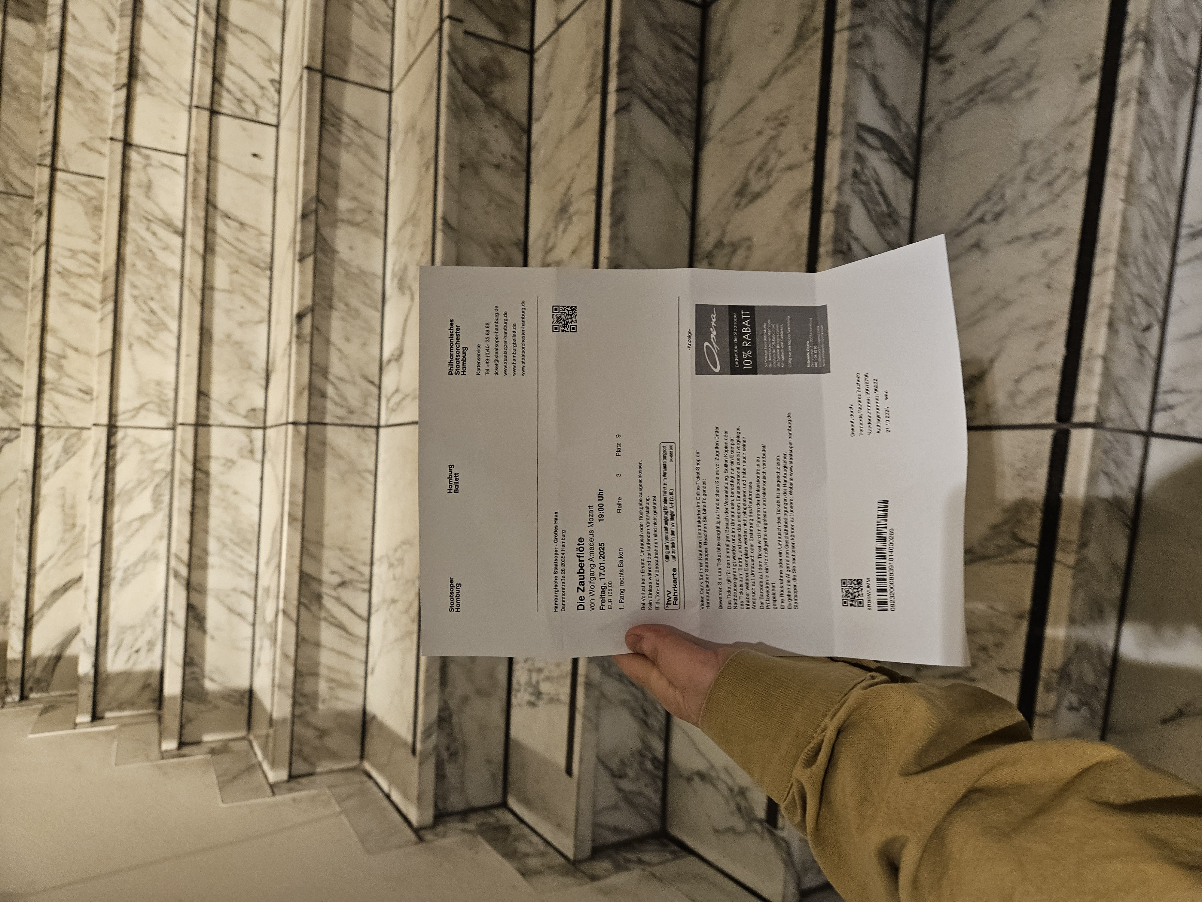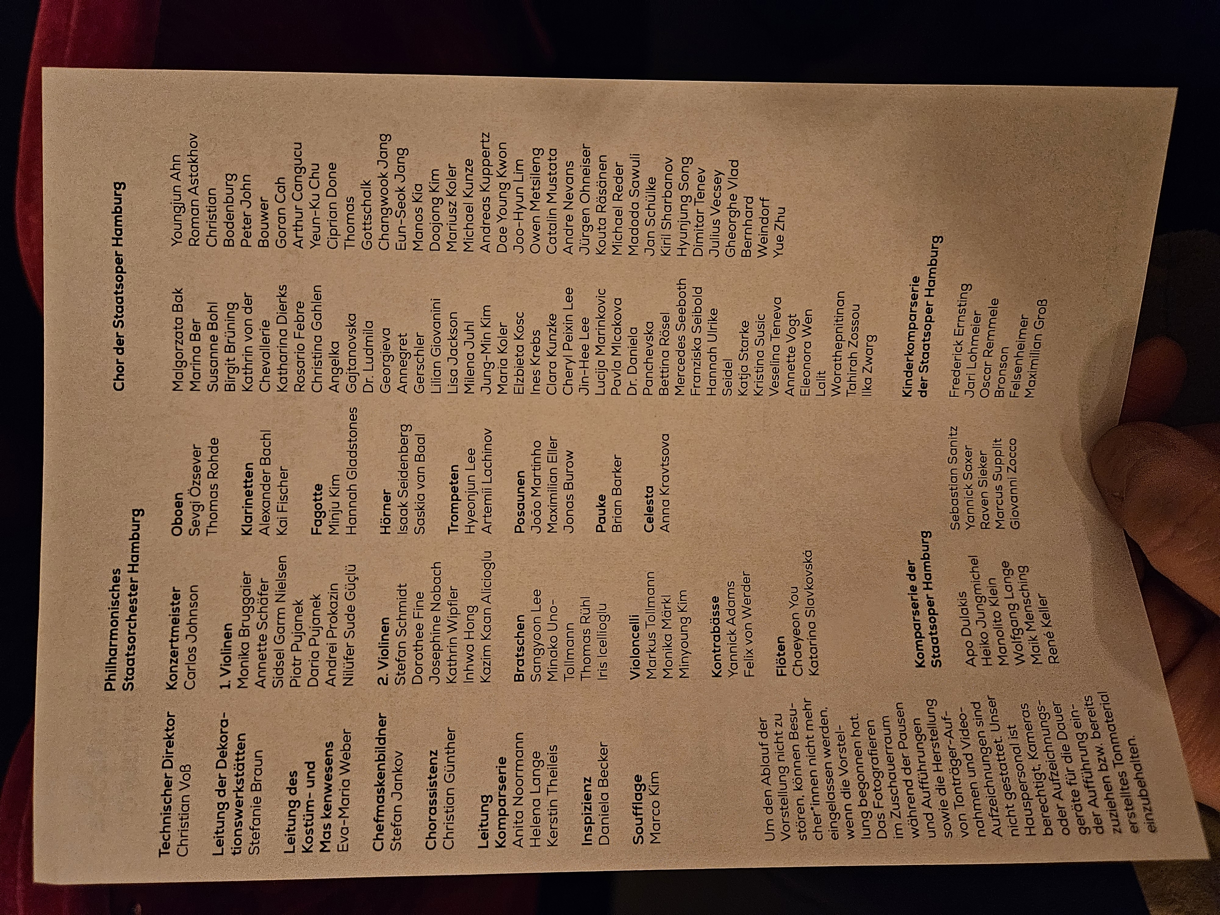 모든 것이 안 좋은 쪽으로 놀라웠던 무대. 중간에 쉬는 시간에 로비에 나오니 주변 독일인들도 어이없어하며 대화를 나누는 게 들려왔음. 오페라 속 왕자가 무릎까지 오는 기장의 청바지와 낡은 후두티를 입고 공연한다는 게 너무 어처구니가 없음.